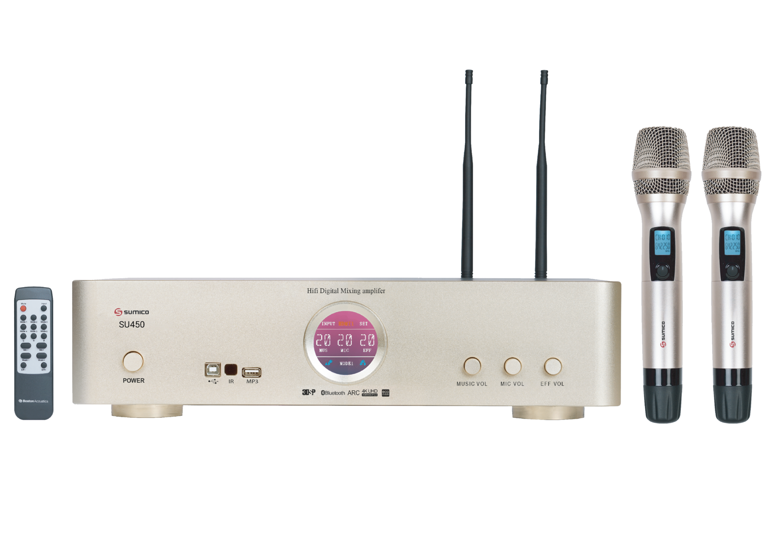 Sumico SU450 là dòng ampli karaoke kỹ thuật số tích hợp vang số và mạch DAC chất lượng cao thuộc thuộc thương hiệu Sumico rất nổi tiếng về các thiết bị karaoke. Sở hữu âm thanh trung thực, mạnh mẽ với nhiều kết nối đa phương tiện thời thượng cùng nhiều tính năng tiện dụng thú vị, ampli karaoke liền vang số SU450 là chiếc ampli kiểu mẫu toàn năng cho hệ thống Karaoke, nghe nhạc và xem phim trong gia đình hiện đại ngày nay.