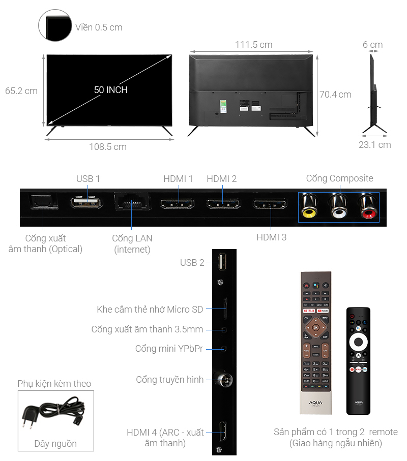 Android Tivi AQUA 4K 50 inch LE50AQT6600UG tô điểm không gian lắp đặt nhờ thiết kế thanh mảnh, sang trọng, màn hình tràn viền độc đáo, tinh tế cả khi lắp đặt treo tường hay trên kệ tủ.