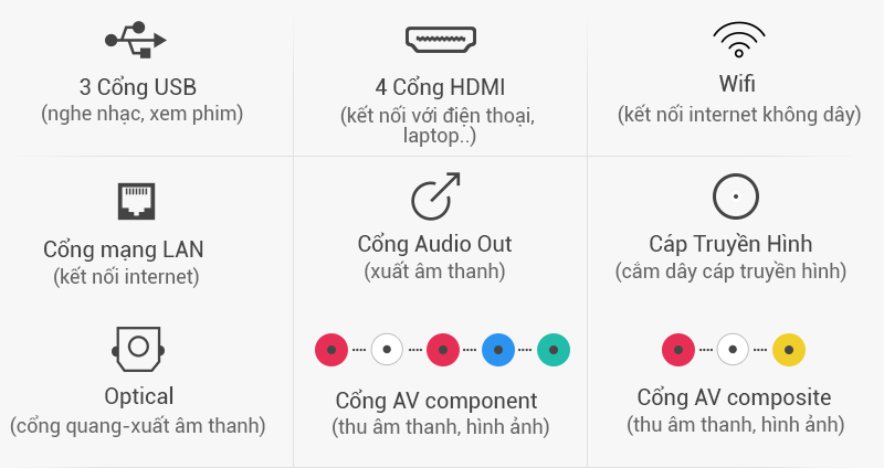 Đầy đủ các cổng kết nối: USB, HDMI, Optical, AV Composite, AV Component…