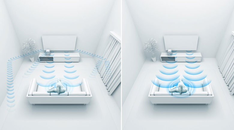 Ngoài ra, âm thanh cũng được tùy chỉnh theo môi trường, công nghệ này tự động phát hiện ra các vật thể làm giảm chất lượng âm thanh nhờ đó tái tạo âm thanh được tăng cường và tối ưu hóa theo phòng của bạn, mang đến cho bạn trải nghiệm âm thanh hoàn hảo.