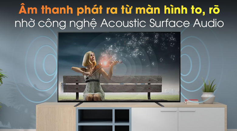 Tivi Sony 4K với công nghệ Acoustic Surface Audio hiện đại cho âm thanh phát ra từ màn hình, màn hình chính là loa. Một thiết bị truyền động tiên tiến phía sau màn hình sẽ run một cách kín đáo để tạo âm thanh, nhờ đó âm thanh sẽ phát ra đúng vị trí của từng cảnh đang chiếu hay lời thoại của các nhân vật, nhờ đó mang đến những trải nghiệm xem tivi tuyệt vời hơn.