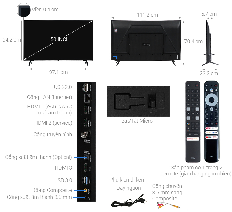 Kích thước tivi TCL 50 inch phù hợp để lắp kiểu để bàn hoặc treo tường trong phòng khách, phòng làm việc, phòng ngủ có diện tích vừa và nhỏ.