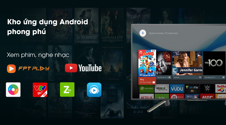 Ngoài ra tivi có tính năng chiếu màn hình điện thoại này còn được cài đặt sẵn các ứng dụng như: Fim+, Youtube, Zing Mp3, FPT Play,… và còn có thể tải hàng ngàn ứng dụng trên kho ứng dụng Google Play.