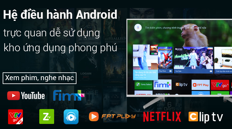 Smart tivi Sony với nền tảng hệ điều hành này bên cạnh kho ứng dụng cài sẵn như: YouTube, Google Play, Netflix, Trình duyệt web,…