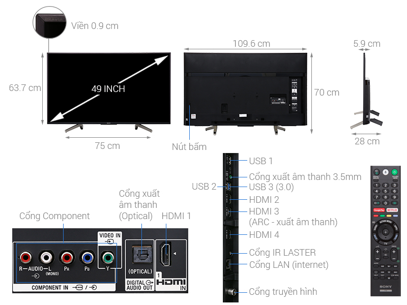 Android Tivi Sony 49 inch KD-49X8500F ra đời vào đầu năm 2018, với thiết kế từ viền hoàn toàn bằng kim và chân đế phủ kim loại loại sáng bóng, cứng cáp, dễ vệ sinh.