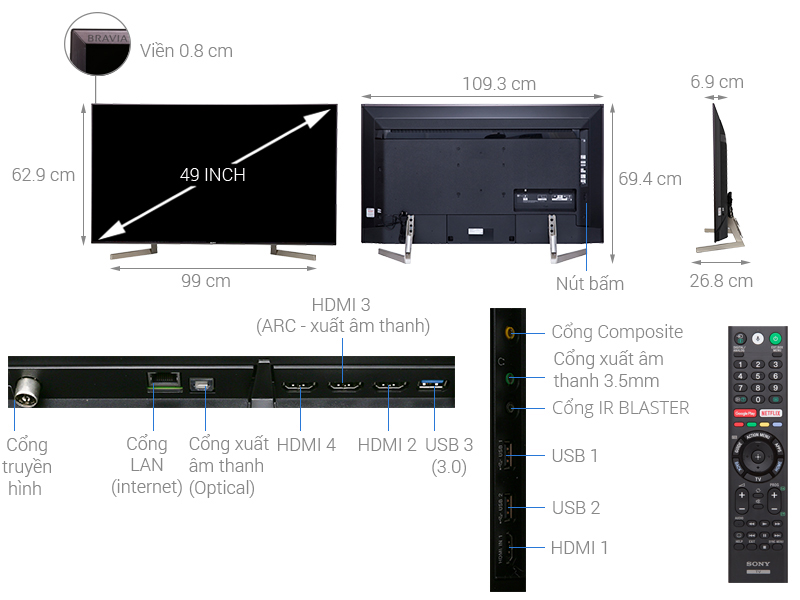 Tivi Sony này có màn hình 49 inch rất thích hợp để đặt ở phòng khách, ngoài ra bạn cũng có thể đặt ở bàn làm việc hoặc treo tường ở phòng ngủ,…