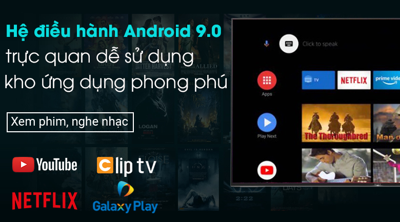 Tivi này sở hữu hệ điều hành Android 9.0 mới nhất với giao diện dễ dùng, phù hợp cho mọi lứa tuổi và kho ứng dụng có sẵn đa dạng như: YouTube, Netflix, Amazon Video,…