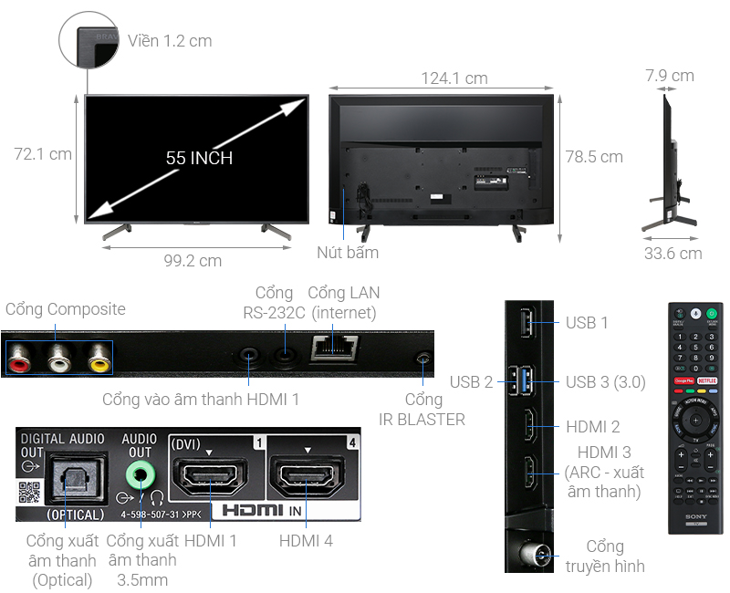 Kích thước tivi 55 inch vừa đủ, thích hợp bố trí vào nhiều không gian nội thất khác nhau như phòng khách, phòng họp,… Ngoài ra với chân đế dạng chữ V kim loại chắc chắn, giúp tivi đứng vững trên nhiều bề mặt khác nhau.