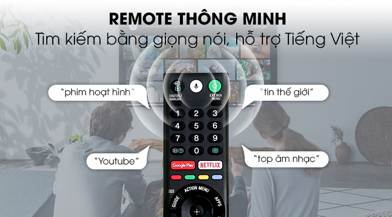 Tivi Sony KD-75X8000G kèm theo chiếc remote thông minh, sẽ giúp bạn tìm kiếm nội dung một cách nhanh chóng bằng giọng nói, có luôn việc hỗ tiếng Việt cho cả 3 vùng miền.