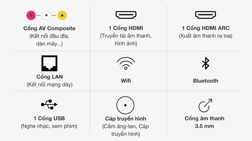 Tivi sở hữu nhiều cổng kết nối thông dụng như: cổng HDMI, cổng AV, USB,… Ngoài ra, bạn cũng có thể dễ dàng kết nối với Bluetooth, Wifi.