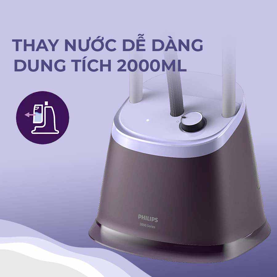 Bàn ủi hơi nước đứng Philips STE3160/30 có dung tích chứa nước là 2000 ml để bạn ủi được nhiều quần áo hơn, tiết kiệm thời gian châm nước nhiều lần, thao tác đơn giản tiện tháo rời để vệ sinh.