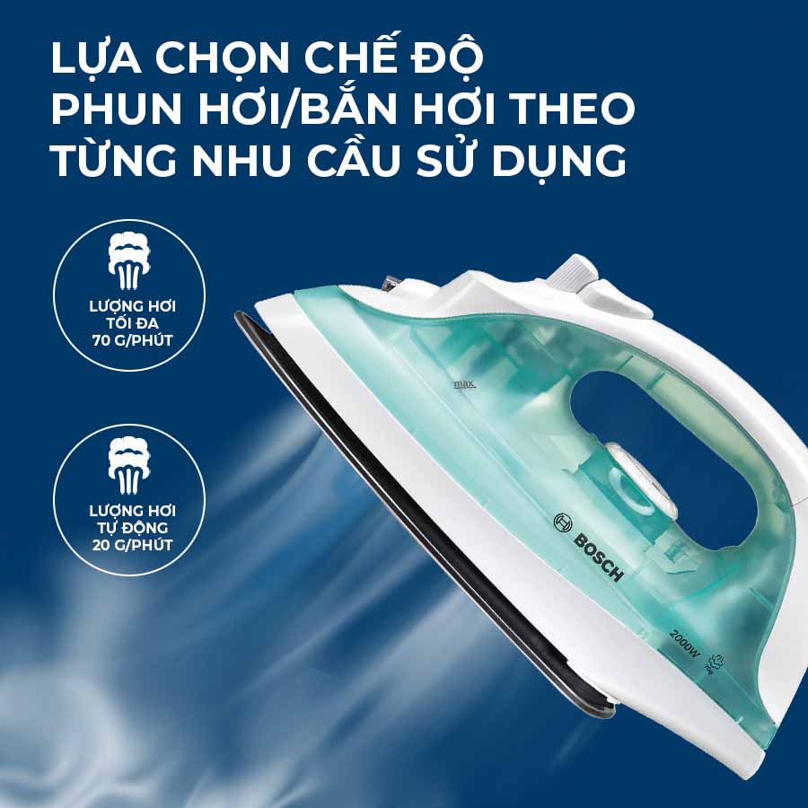 Bàn là hơi nước Bosch TDA2301GB được thiết kế tiện dụng với trọng lượng chỉ 1.1kg. Điều này dùng người dùng cầm nắm nhẹ nhàng hơn mà không tốn nhiều sức.