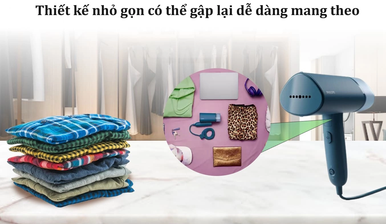 Bàn ủi hơi nước cầm tay Philips STH3000/20 thiết kế nhỏ gọn, có thể gập lại dễ dàng cất giữ, tiết kiệm không gian, tiện mang theo khi đi du lịch hay công tác xa nhà. Khối lượng nhẹ chỉ khoảng 0.775 kg tiện cầm nắm khi ủi. Thiết kế cầm tay nhỏ gọn, không cần ván ủi vẫn có thể ủi được, tiết kiệm thời gian và giảm bớt phiền phức.