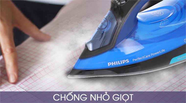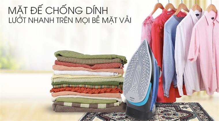 Bàn là Philips có mặt đế chống dính SteamGlide Plus – độc quyền của Philips, được tráng 6 lớp chống ăn mòn, chống trầy cực bền tốt, lướt nhẹ và êm ái trên mọi chất liệu vải, làm sạch đơn giản khi cần.