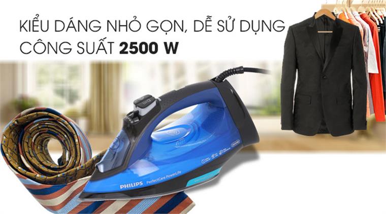 Bàn ủi công suất mạnh mẽ 2500W gia nhiệt tức thì, ủi hiệu quả mọi vết nhăn cứng đầu.
