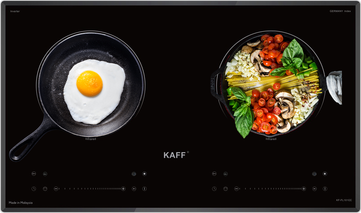 Bếp điện Kaff KF-FL101CC gồm 2 vùng nấu hồng ngoại với tổng công suất là 4400W. Vùng nấu hồng ngoại trái trang bị mâm nhiệt cao cấp E.G.O Hi-light với 02 vòng nhiệt có công suất tối đa là 2200W. Vùng nấu hồng ngoại phải trang bị mâm nhiệt cao cấp E.G.O Hi-light với 02 vòng nhiệt có công suất tối đa là 2200W. Bếp hoạt động theo nguyên lí bức xạ nhiệt của tia hồng ngoại, đốt nóng mặt kính và truyền nhiệt qua đáy nồi và làm chín thức ăn bên trong. Nhờ nguyên lí hoạt động này nên bếp hoàn toàn không kén nồi, bạn có thể sử dụng tất cả các loại xoong nồi có sẵn trong gia đình.