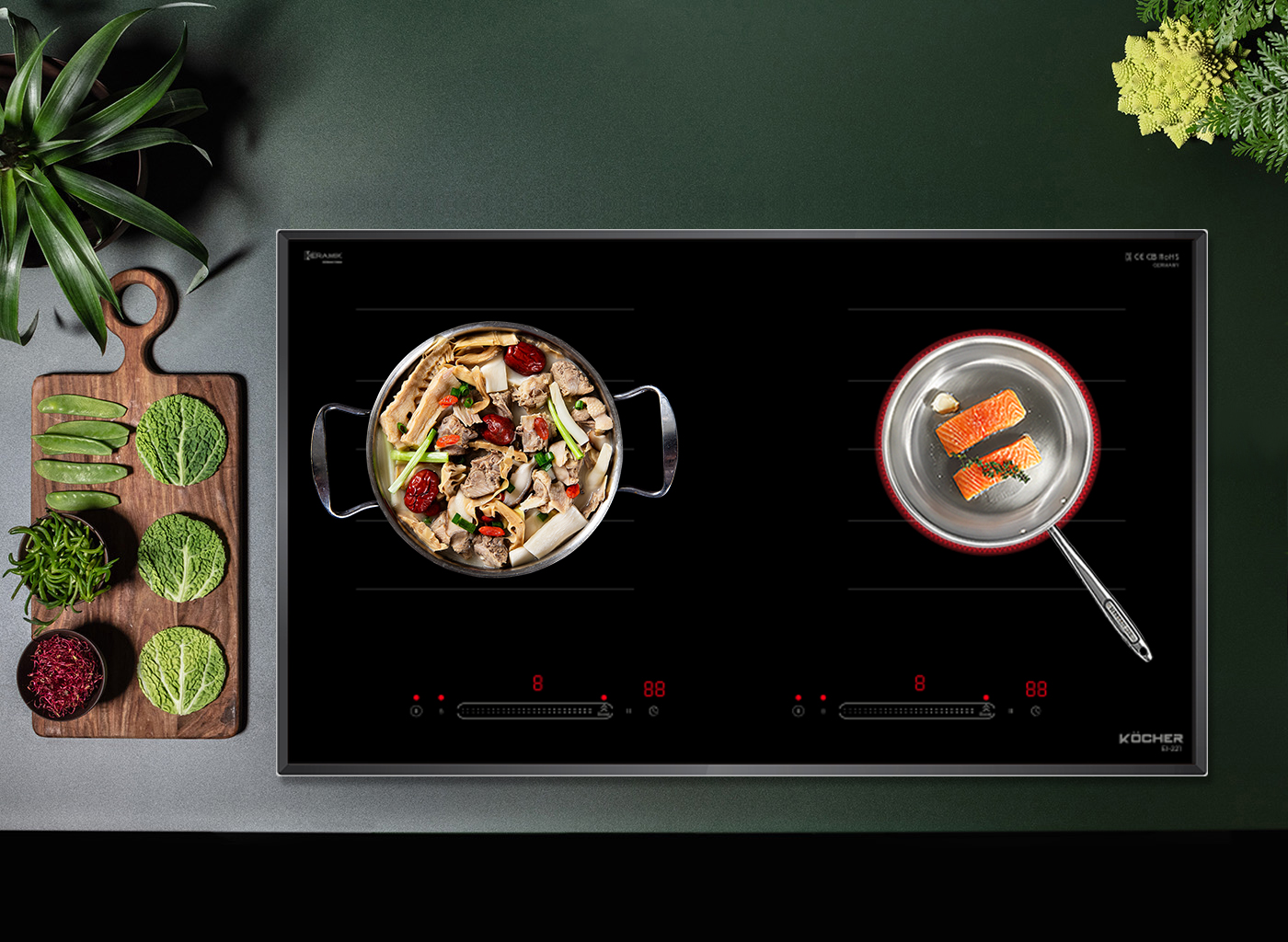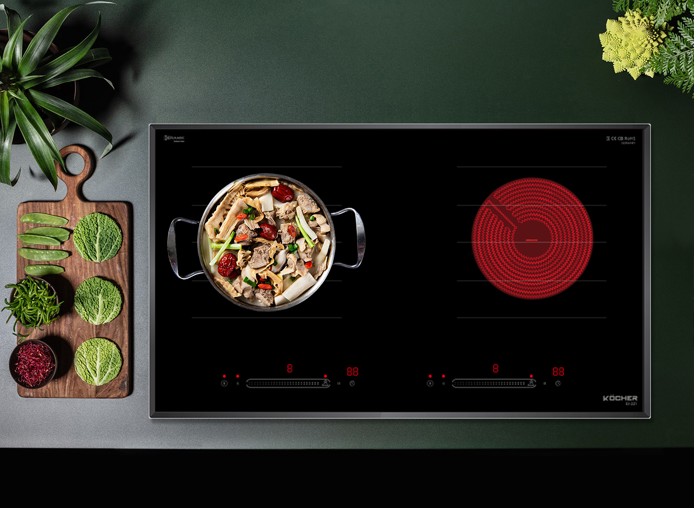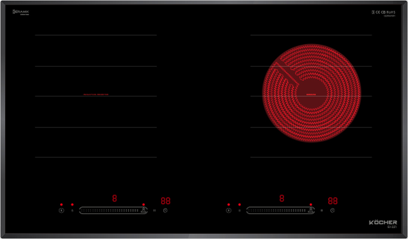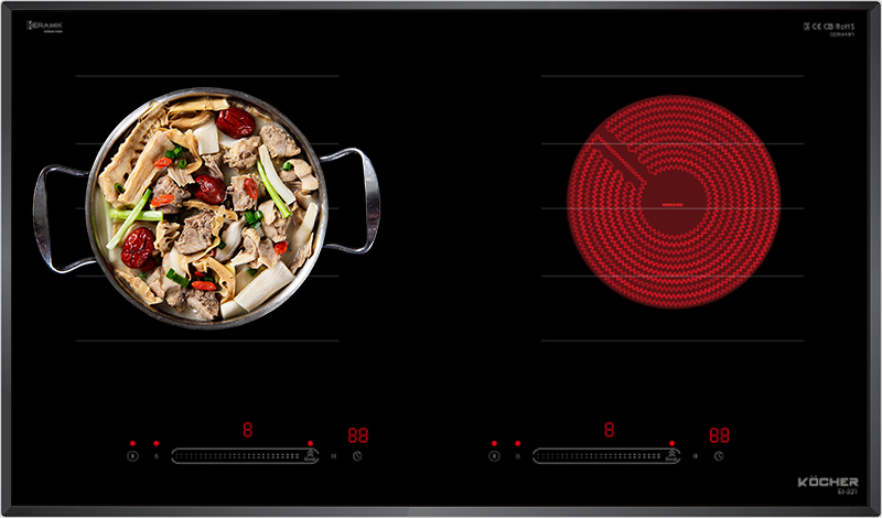 Bếp điện từ Kocher EI-221 gồm 2 vùng nấu với tổng công suất là 4200W. Vùng nấu từ trái có công suất là 2000W khi kích hoạt tính năng nấu siêu nhanh Booster công suất lên tới 2200W. Vùng nấu hồng ngoại phải trang bị mâm nhiệt Hi-light 2 vòng nhiệt với công suất là 2000W.