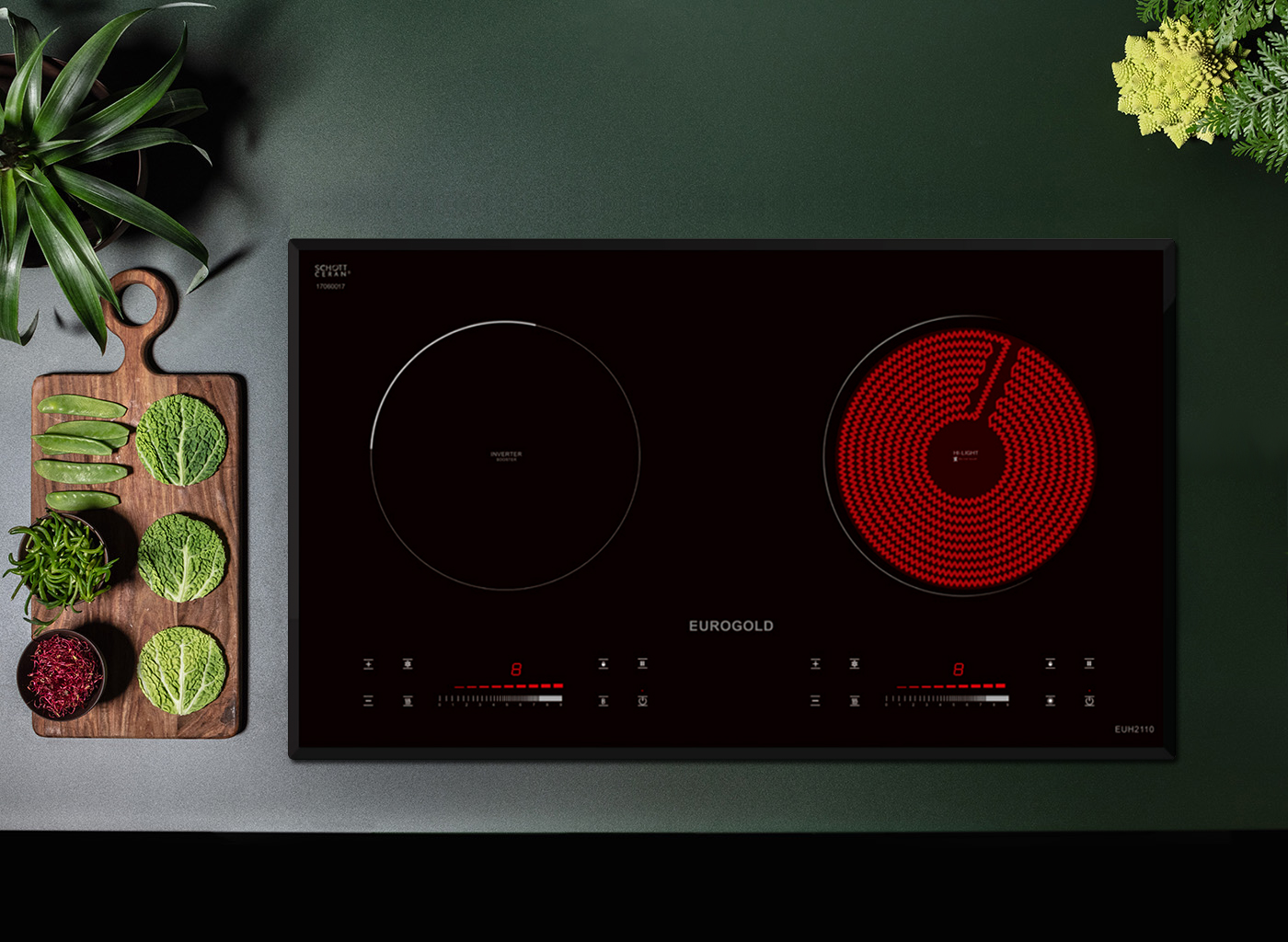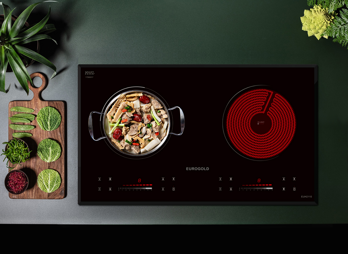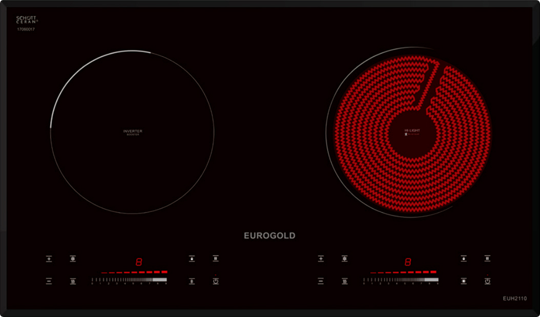 Bếp điện từ Eurogold EUH2110 gồm 2 vùng nấu với tổng công suất 3700W. Vùng nấu từ trái có công suất 2300W khi kích hoạt tính năng nấu nhanh Booster công suất lên tới 3000W. Vùng nấu hồng ngoại sử dụng mâm nhiệt Hi-light với 02 vòng nhiệt có công suất 2300W.