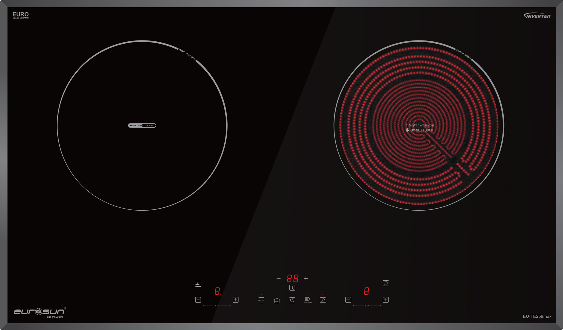Bếp điện từ Eurosun EU-TE259Max được tích hợp chức năng tự nhận diện vùng nấu, khi ta đặt nồi lên vùng nấu từ sau đó ấn nút khởi động bếp sau thời gian 1-2 giây bếp sẽ tự động tìm vùng nấu đã có nồi, ta chỉ việc điều chỉnh mức công suất to nhỏ theo ý muốn mà không phải thao tác chọn vùng nấu như bếp thông thường. Công nghệ Inverter được áp dụng trên bếp điện từ Eurosun EU-TE259Max có khả năng phản ứng thay đổi công suất theo điều khiển ngay tức thì, khi người dùng điều chỉnh tăng giảm nhiệt độ đun nấu, bếp điều chỉnh thay đổi tức thì về mức nhiệt độ mong muốn.