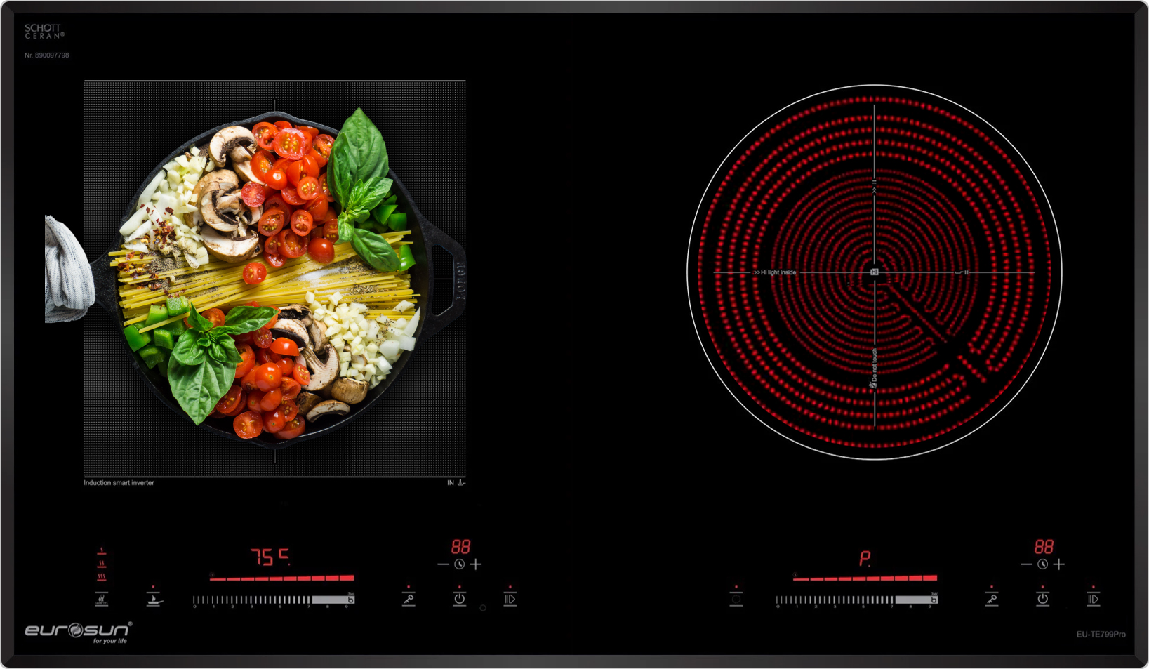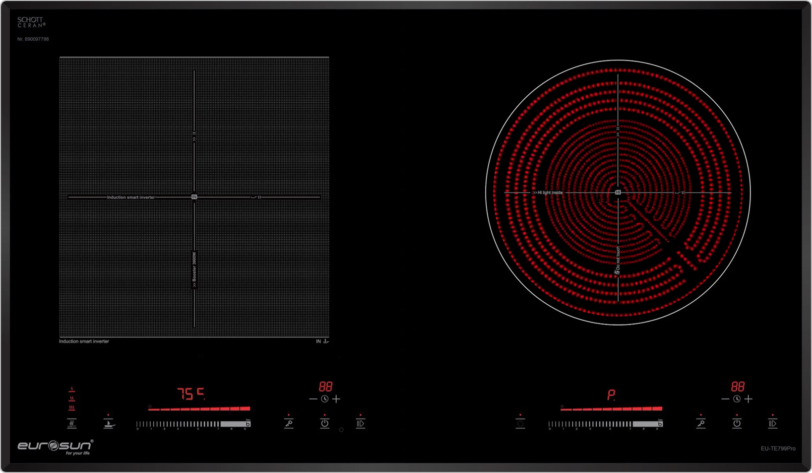 Bếp điện từ Eurosun EU-TE799Pro gồm 2 vùng nấu với tổng công suất 5000W. Vùng nấu từ trái có công suất 2100W khi kích hoạt tính năng năng nấu nhanh Booster công suất lên tới 2800W. Vùng nấu phải hồng ngoại sử dụng mâm nhiệt Hi-light 02 vòng nhiệt với mức công suất vòng nhiệt lớn là 2200W và công suất vòng nhiệt nhỏ là 1000W.