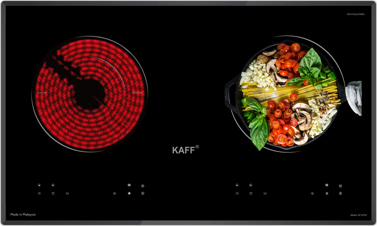 Bếp điện từ Kaff KF-073IC được tích hợp chức năng tự nhận diện vùng nấu, khi ta đặt nồi lên 1 trong 2 vùng nấu sau đó ấn nút khởi động bếp sau thời gian 1-2 giây bếp sẽ tự động tìm vùng nấu đã có nồi, ta chỉ việc điều chỉnh mức công suất to nhỏ theo ý muốn mà không phải thao tác chọn vùng nấu như bếp thông thường. Công nghệ Inverter được áp dụng trên bếp điện từ Kaff KF-073IC có khả năng phản ứng thay đổi công suất theo điều khiển ngay tức thì, khi người dùng điều chỉnh tăng giảm nhiệt độ đun nấu, bếp điều chỉnh thay đổi tức thì về mức nhiệt độ mong muốn.