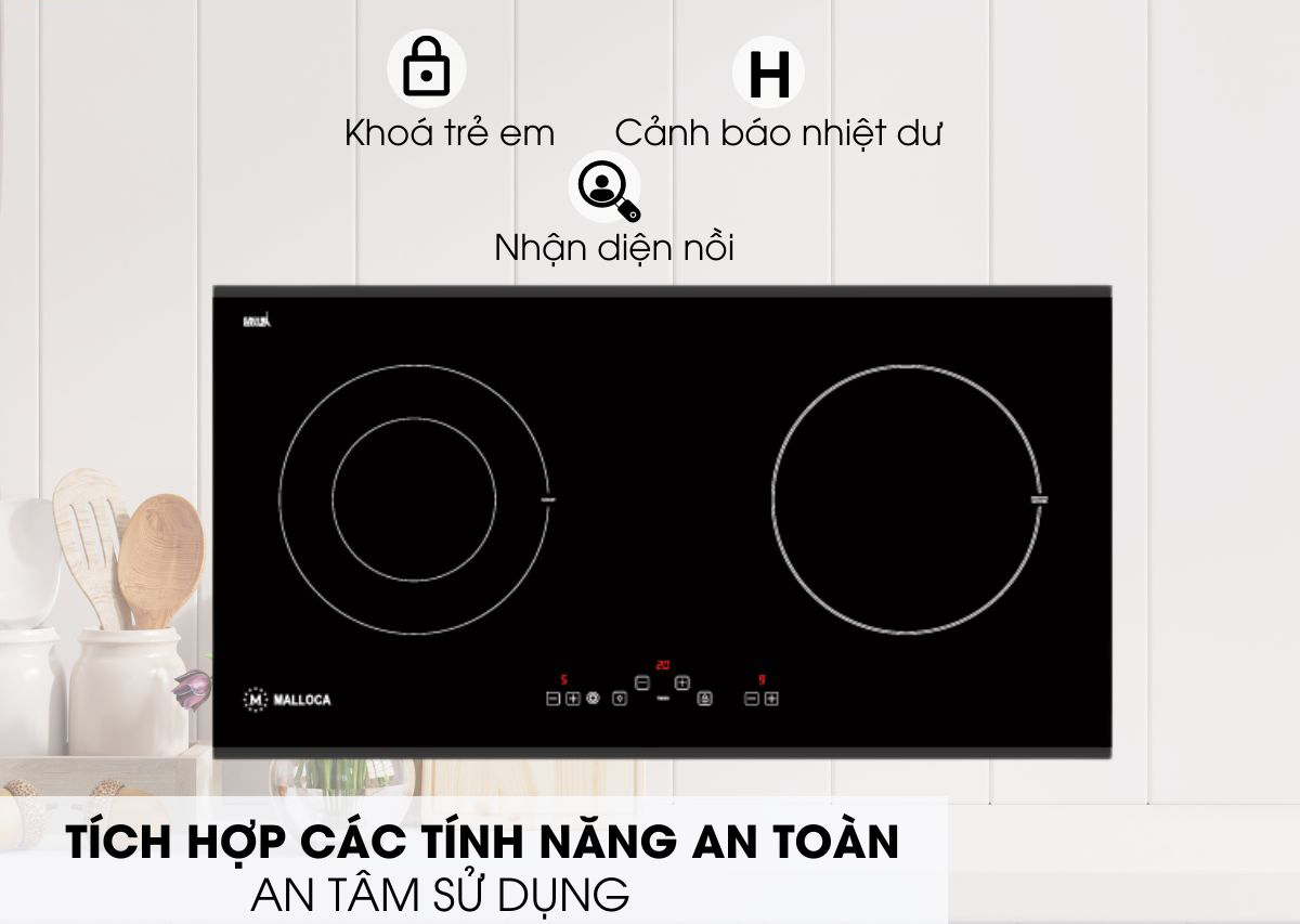 Khóa an toàn trẻ em: Hãng Malloca trang bị chế độ khóa an toàn trẻ em độc lập dành riêng cho từng bếp. Chức năng này giúp ngăn ngừa trẻ nhỏ có vô tình chạm tay vào bếp thì cũng không điều khiển được. Khi bạn muốn điều khiển lại bếp thì chỉ việc mở khóa trên bảng điều khiển.