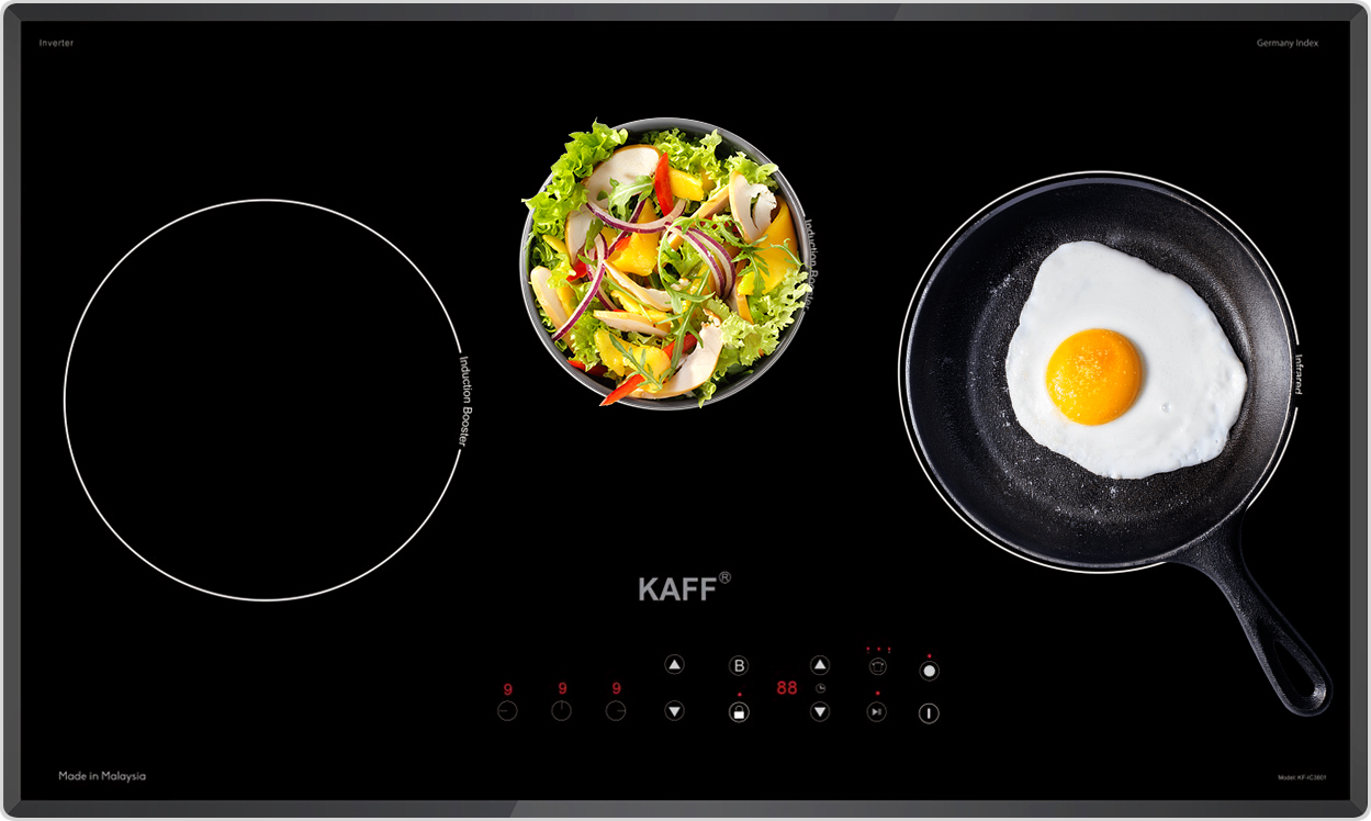 Bếp điện từ Kaff KF-IC3801 gồm 3 vùng nấu với tổng công suất 5900W. Vùng nấu từ lớn có khả năng đun nấu siêu nhanh và tiết kiệm điện năng với công suất 2200W khi kích hoạt tính năng Booster công suất lên tới 3500W. Vùng nấu từ nhỏ có khả năng đun nấu siêu nhanh và tiết kiệm điện năng với công suất 1500W khi kích hoạt tính năng Booster công suất lên tới 2800W. Vùng nấu hồng ngoại sử dụng mâm nhiệt E.G.O Hi-Light với 02 vòng nhiệt có công suất 2200W. Chỉ trong chốc lát sau khi kích hoạt tính năng này, nhiệt lượng trên vùng nấu từ tăng lên công suất tương đương với mức nhiệt lượng lớn nhất. Do đó, các món ăn được nấu chín nhanh hơn, tiết kiệm thời gian vào bếp cho chị em nội trợ. Chức năng Booster nấu siêu nhanh, tuy nhiên thời gian tối đa mặc định dùng chức năng này là 10 phút / lần tránh quá tải.