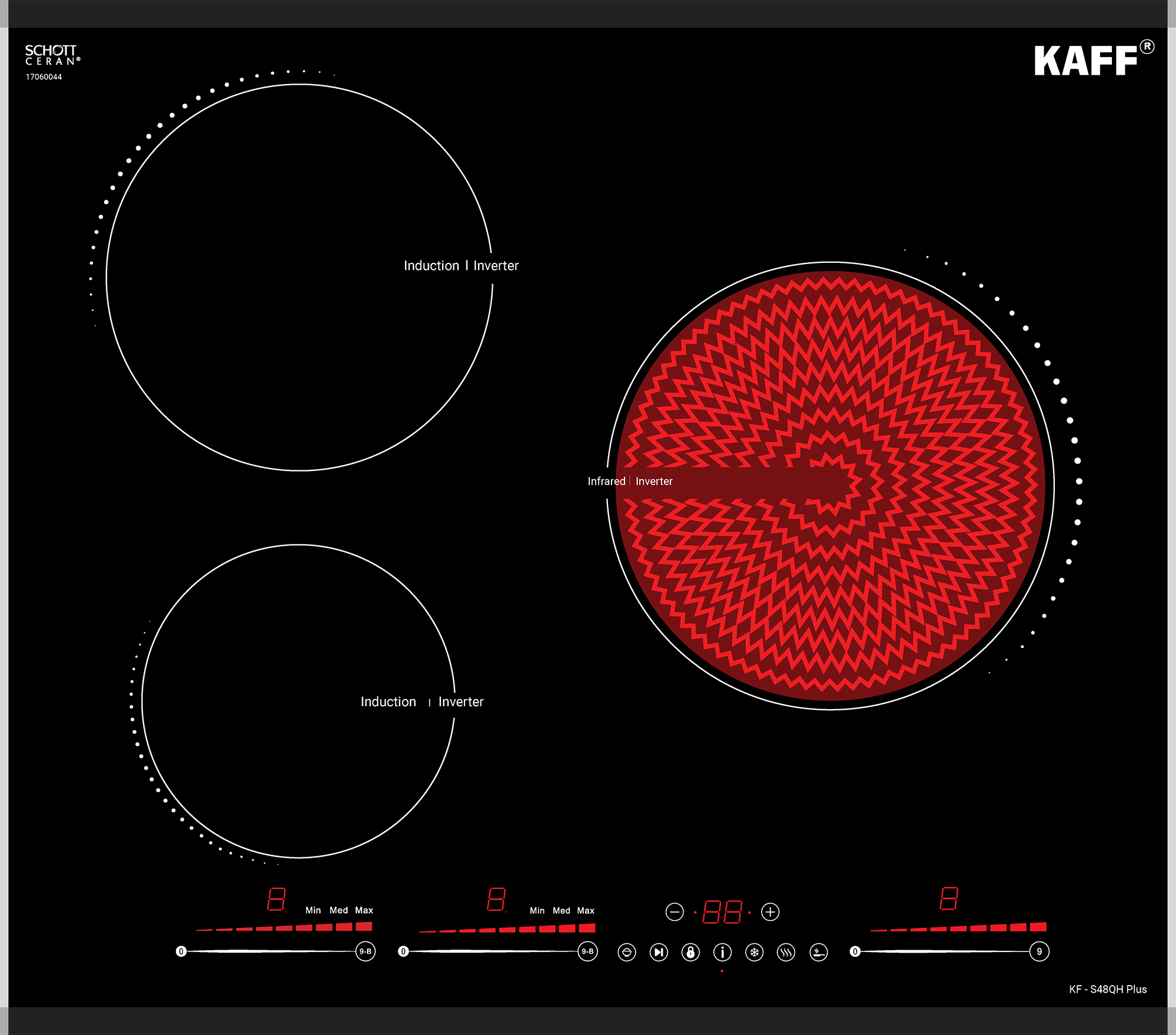 Bếp điện từ Kaff KF-S48QH Plus gồm 3 vùng nấu với tổng công suất 5500W. Vùng nấu từ bên trái phía trên có công suất 1800W khi kích hoạt tính năng nấu nhanh Booster công suất lên tới 3200W. Vùng nấu từ bên trái phía dưới có công suất 1200W khi kích hoạt tính năng nấu nhanh Booster công suất lên tới 1500W. Vùng nấu hồng ngoại bên phải sử dụng mâm nhiệt E.G.O Hi-Light với 02 vòng nhiệt có công suất tối đa 2500W. Chỉ trong chốc lát sau khi kích hoạt tính năng này, nhiệt lượng trên vùng nấu từ tăng lên công suất tương đương với mức nhiệt lượng lớn nhất. Do đó, các món ăn được nấu chín nhanh hơn, tiết kiệm thời gian vào bếp cho chị em nội trợ. Chức năng Booster nấu siêu nhanh, tuy nhiên thời gian tối đa mặc định dùng chức năng này là 10 phút / lần tránh quá tải.