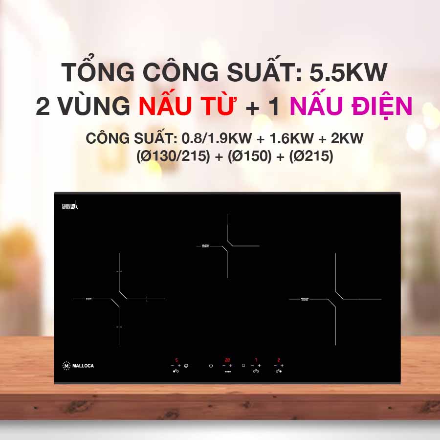 Với gia nhiều có nhiều thành viên, một chiếc bếp 3 vùng nấu sẽ là lựa chọn phù hợp để nâng cao hiệu suất nấu ăn hằng ngày. Bếp điện từ Malloca MH 03IR N sở hữu 2 vùng nấu từ + 1 vùng nấu điện sẽ là chiếc bếp đáp ứng hoàn hảo cho nhu cầu này. Ngoài thiết kế lắp âm hiện đại, bếp còn trang bị nhiều tính năng hữu ích khoá an toàn, hẹn giờ, báo dư nhiệt,… đem lại sự tiện dụng trong quá trình sử dụng.