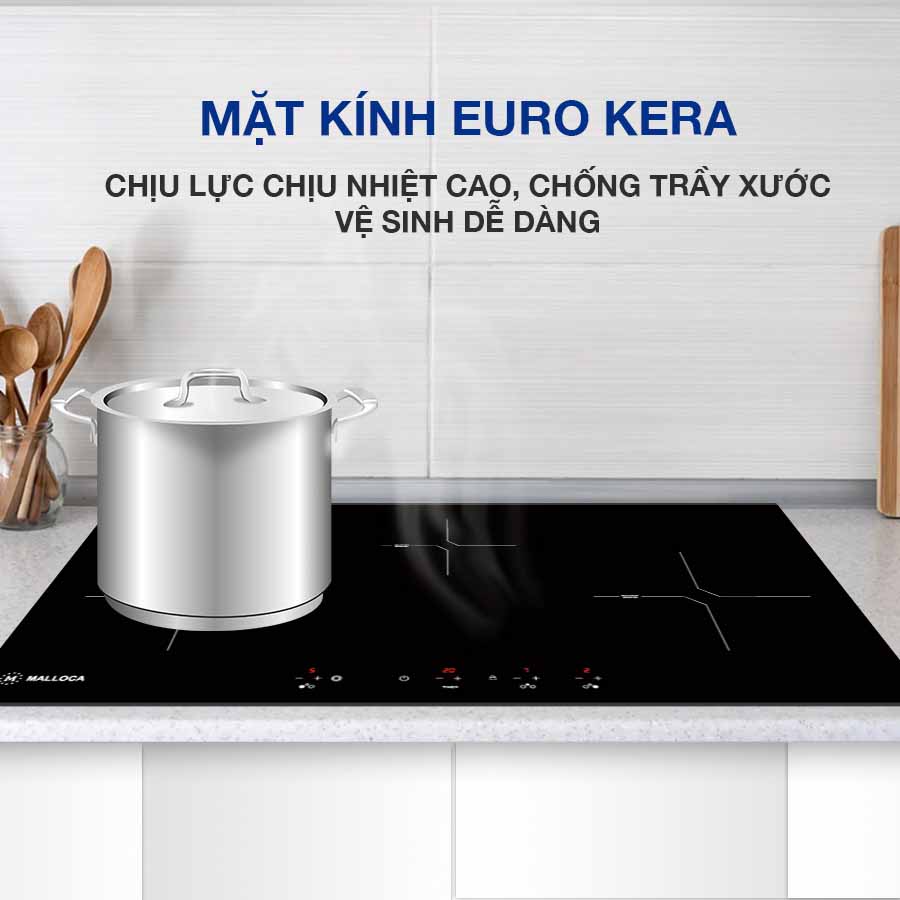 Eurokera là một trong những được sử dụng phổ biến trên các dòng bếp điện từ nói chung và bếp điện từ Malloca nói riêng. Ưu điểm của mặt kính này là độ bền cao, chống trầy xước khi va chạm, chịu được nhiệt độ cao và ít bám bẩn giúp dễ vệ sinh. Ngoài ra, kính còn hỗ trợ tối ưu hóa hiệu quả truyền nhiệt qua phần mặt kính, chính vì thế mà phần nhiệt được truyền qua mặt kính đến nồi tương đối trọn vẹn mà không hề xảy ra tình trạng bị thất thoát.
