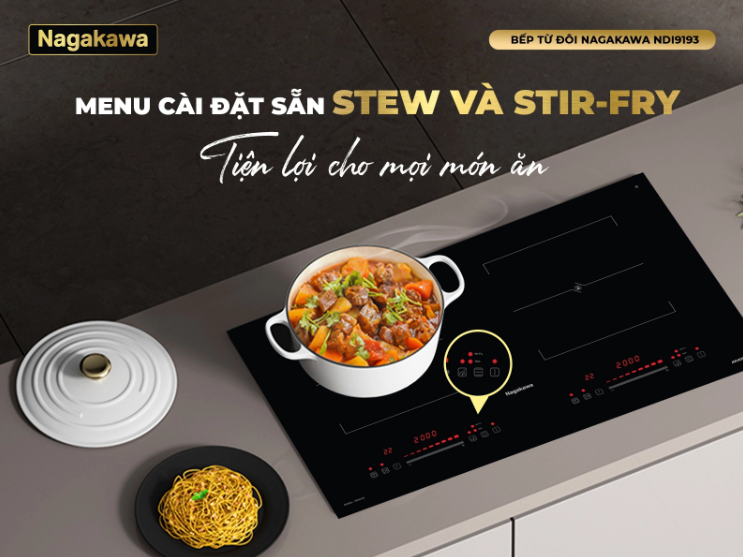 Bếp từ Nagakawa NDI9193 được trang bị menu cài đặt sẵn Stwe và Stir-fry, giúp bạn nấu nướng dễ dàng chỉ với một chạm: