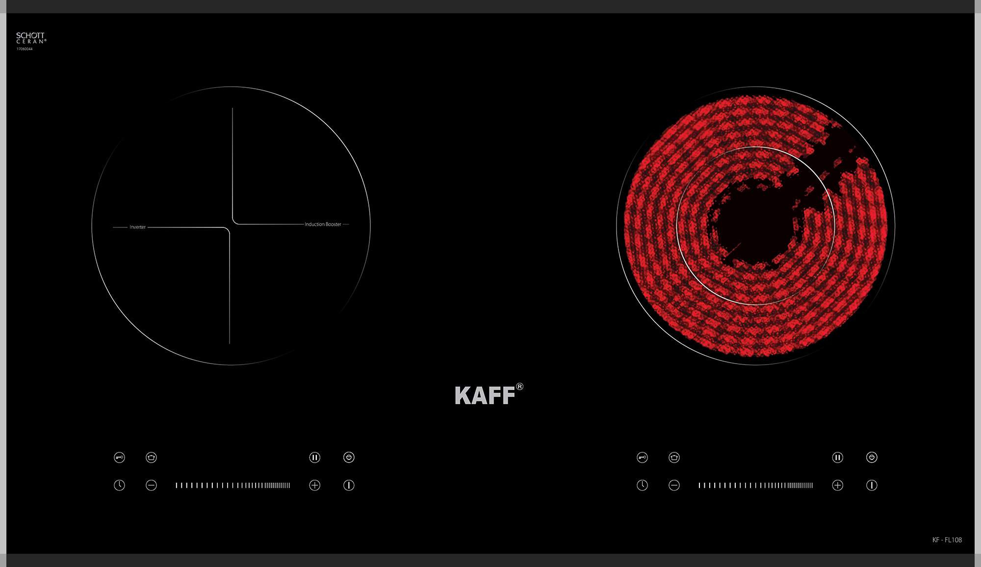 Bếp điện từ Kaff KF-FL108 được tích hợp chức năng tự nhận diện vùng nấu, khi ta đặt nồi lên 1 trong 2 vùng nấu sau đó ấn nút khởi động bếp sau thời gian 1-2 giây bếp sẽ tự động tìm vùng nấu đã có nồi, ta chỉ việc điều chỉnh mức công suất to nhỏ theo ý muốn mà không phải thao tác chọn vùng nấu như bếp thông thường. Công nghệ Inverter được áp dụng trên bếp điện từ Kaff KF-FL108 có khả năng phản ứng thay đổi công suất theo điều khiển ngay tức thì, khi người dùng điều chỉnh tăng giảm nhiệt độ đun nấu, bếp điều chỉnh thay đổi tức thì về mức nhiệt độ mong muốn.