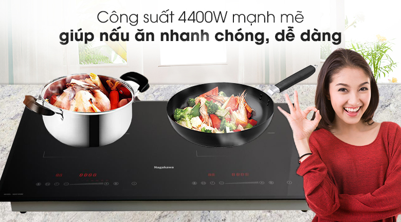 Bếp từ đôi Nagakawa NAG1202M trang bị tính năng Booster cho cả hai vùng nấu với công suất tối đa cho vùng nấu trái đạt 2400W, vùng nấu phải 2000W. Tổng công suất của cả bếp đạt 4400W, mức công suất khá cao so với các dòng bếp từ đôi cùng phân khúc. Dải công suất được chia thành các mức nhỏ giúp bạn có nhiều mức nhiệt để lựa chọn, phù hợp với từng món ăn. Thức ăn được nấu đủ nhiệt sẽ giữ được nhiều dưỡng chất nhất.