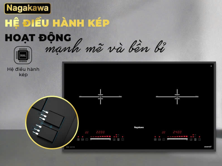 Hệ điều hành kép là điểm mạnh vượt trội của bếp đôi điện từ Nagakawa NAG1214M. Bếp Nagakawa thế hệ mới sử dụng 2 hoặc nhiều thanh công suất IGBT tạo thành cơ chế hoạt động thông minh: các IGBT có thể hoạt động đồng thời giúp cho bếp có thể đạt công suất tối đa 2400W trong vòng vài giây, giúp nấu nướng nhanh chóng và tiết kiệm thời gian. Đồng thời, các IGBT có thể hoạt động luân phiên theo lệnh điều hành từ trung tâm, nhờ công nghệ biến tần giúp tiết kiệm năng lượng và đảm bảo tuổi thọ của bếp.