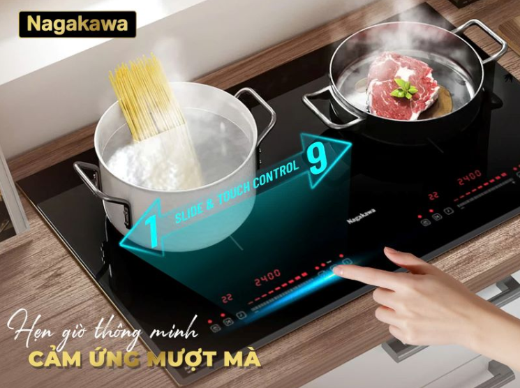 Với bếp đôi điện từ Nagakawa NK2C01M, bạn có thể quyết định cách điều chỉnh tăng giảm công suất bằng cách vuốt di chuyển trái, phải hoặc trực tiếp ấn phím điều chỉnh 9 mức công suất. Chỉ cần thao tác cảm ứng nhẹ nhàng, bếp sẽ tự động nhận diện và thực hiện lệnh điều khiển chính xác và nhanh chóng.