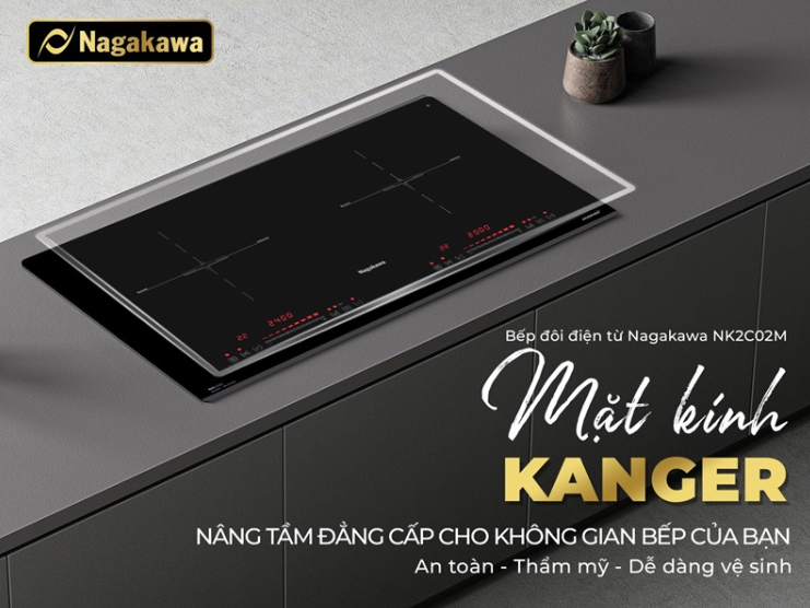 Bếp đôi điện từ Nagakawa NK2C02M sử dụng mặt kính Kanger từ thương hiệu mặt kính nổi tiếng được thiết kế mài vát một cạnh tinh tế, bo viền nhôm sang trọng, mang lại vẻ đẹp hiện đại cho căn bếp của bạn.