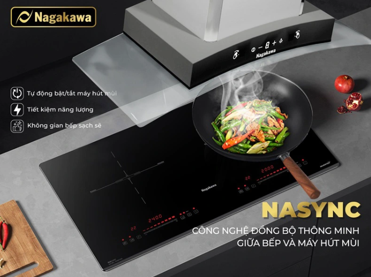 Tích hợp công nghệ NaSYNC – Công nghệ kết nối thông minh độc quyền từ Nagakawa, tự động bật và tắt hút mùi khi bếp điện từ hoạt động, mang lại trải nghiệm nấu nướng vượt trội. Khi bạn bật bếp điện từ, máy hút mùi sẽ tự động kích hoạt sau 1 phút để loại bỏ khói và mùi thức ăn hiệu quả. Ngược lại, khi bạn tắt bếp, máy hút mùi sẽ tiếp tục hoạt động thêm 1 phút để đảm bảo không gian bếp được hoàn toàn sạch sẽ. NaSYNC giúp tối ưu hóa việc sử dụng năng lượng, chỉ hoạt động khi cần thiết, tránh lãng phí điện năng.