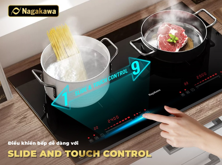 Với bếp đôi điện từ Nagakawa NK2C02M, bạn có thể quyết định cách điều chỉnh tăng giảm công suất bằng cách vuốt di chuyển trái, phải hoặc trực tiếp ấn phím điều chỉnh 9 mức công suất. Chỉ cần chạm nhẹ vào phím điều chỉnh để lựa chọn, thao tác rất mượt mà, nhanh chóng và chính xác.