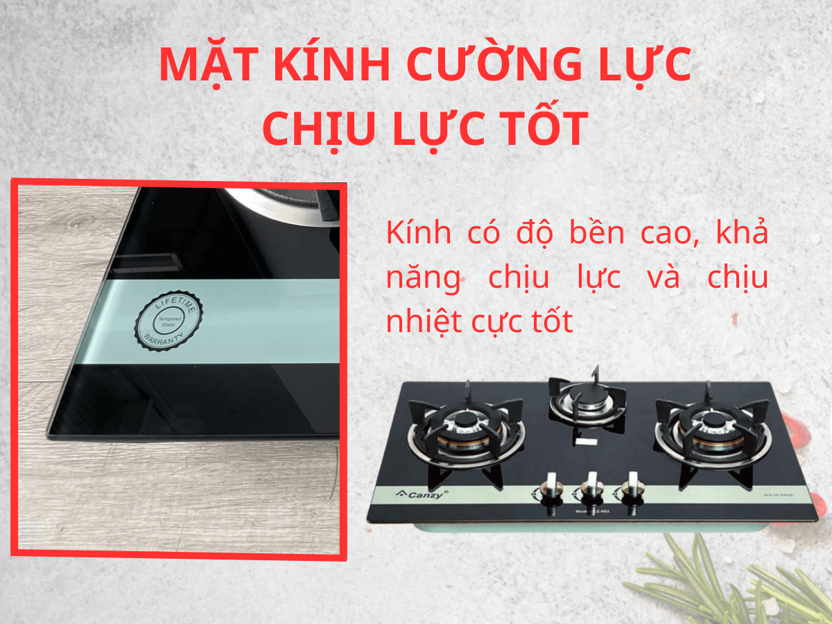 Bếp Gas Canzy CZ 863 sang trọng với mặt kính cường lực màu đen kết hợp viền trắng phù hợp với hầu hết mọi không gian bếp. Kết cấu mặt kính dày 8mm làm tăng khả năng chịu lực, chịu nhiệt, hạn chế các vết trầy xước và va đập, đảm bảo tuổi thọ cao khi sử dụng. Bề mặt kính phẳng, trơn bóng, dễ dàng vệ sinh sau khi sử dụng, chỉ cần chiếc khăn mềm ẩm lau qua có thể làm sạch mọi vết dầu mỡ một cách dễ dàng, nhanh chóng.