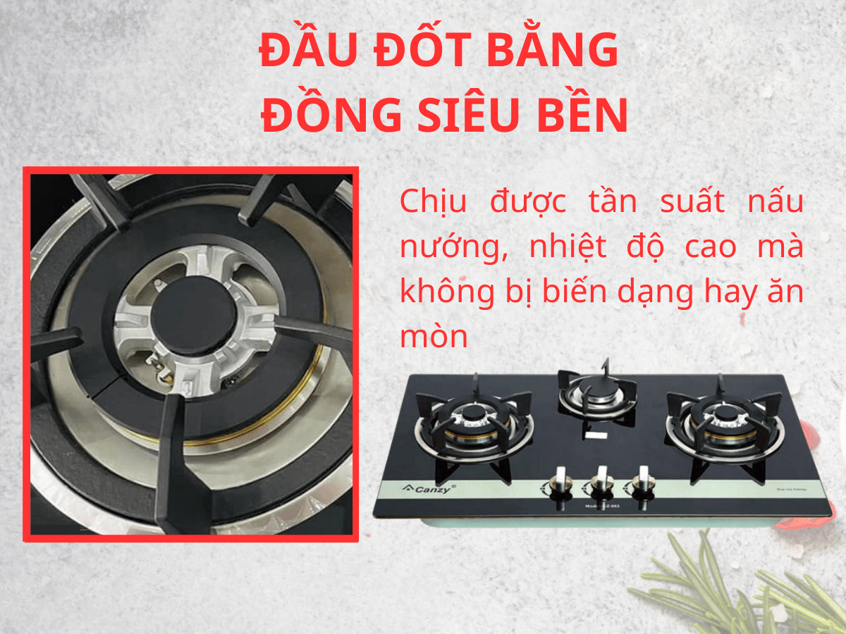 Bếp Gas Canzy CZ 863 được trang bị đầu đốt bằng chất liệu đồng cao cấp được gia công tỉ mỉ, độ bền cao, giúp tạo ngọn lửa xanh tiết kiệm năng lượng và không bị gỉ sét cũng như hao mòn dưới tác động của nhiệt cao trong quá trình nấu nướng.