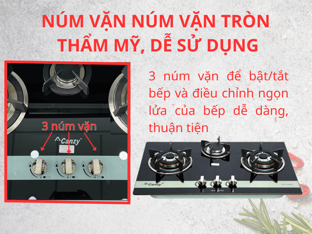 Bếp Gas Canzy CZ 863 thiết kế tinh tế với 3 núm vặn điều khiển đặt trực tiếp trên mặt kính bếp, giúp bạn bật/tắt bếp hay điều chỉnh mức lửa đều thuận tiện và dễ dàng. Núm vặn được làm từ chất liệu kim loại cao cấp màu inox, hạn chế rỉ sét, làm nổi bật lên vẻ đẹp sang trọng cho sản phẩm.