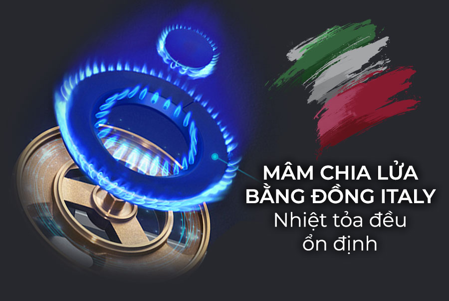 Mâm chia lửa bằng đồng nguyên chất được dập nóng hoàn thiện CNC và được phủ men chống cháy chịu nhiệt cao, tạo nên ngọn lửa xanh cháy hiệu quả, giúp bạn có thể nấu chín thức ăn nhanh hơn mà không hao tốn nhiều năng lượng. Mâm chia lửa bếp ga âm Eurosun EU-GA281 được thiết kế cháy trong tạo công suất nhiệt lớn, cho ngọn lửa truyền nhiệt lượng tập trung vào đáy nồi ổn định và chính xác, không gây thất thoát nhiệt lượng ra ngoài lên tiết kiệm đến hơn 30% lượng gas tiêu thụ.