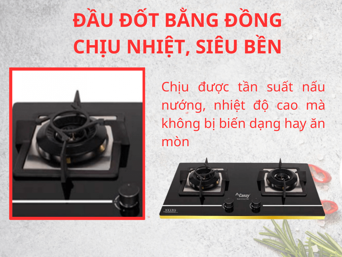 Bếp Gas Canzy CZ Smart 788G được trang bị 2 đầu đốt bằng đồng cao cấp. Đầu đốt này giúp tạo ra ngọn lửa xanh bắt mắt, giúp tiết kiệm gas và đặc biệt là không làm đen đáy nồi. Đầu đốt được thiết kế với các rãnh nhỏ giúp tạo ra ngọn lửa tỏa rộng và phân bổ đều làm chín đều món ăn. Bên cạnh đó, đầu đốt còn được làm từ chất liệu đồng có độ bền cao, chống ăn mòn hay biến dạng sau thời gian dài sử dụng.