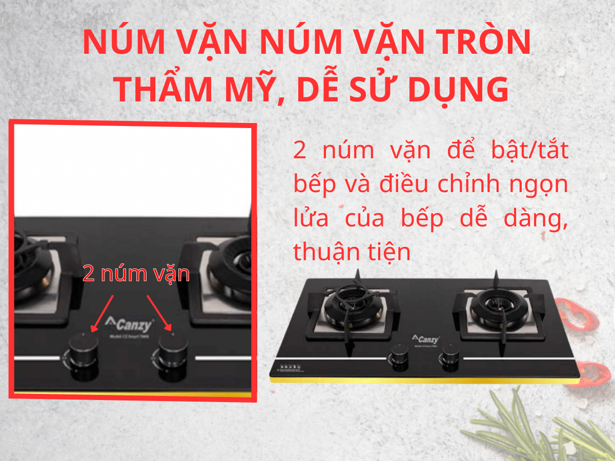 Bếp Gas Canzy CZ Smart 788G được thiết kế hệ thống điều khiển gồm 2 núm vặn tròn bố trí ngay mặt trên bếp, giúp điều khiển bếp dễ dàng, thuận tiện. 2 núm vặn bằng kim loại được hãng tỉ mỉ thiết kế cùng màu với bề mặt bếp, tạo nên sự hài hoà, giúp tăng thêm tính thẩm mỹ, tinh tế cho sản phẩm.