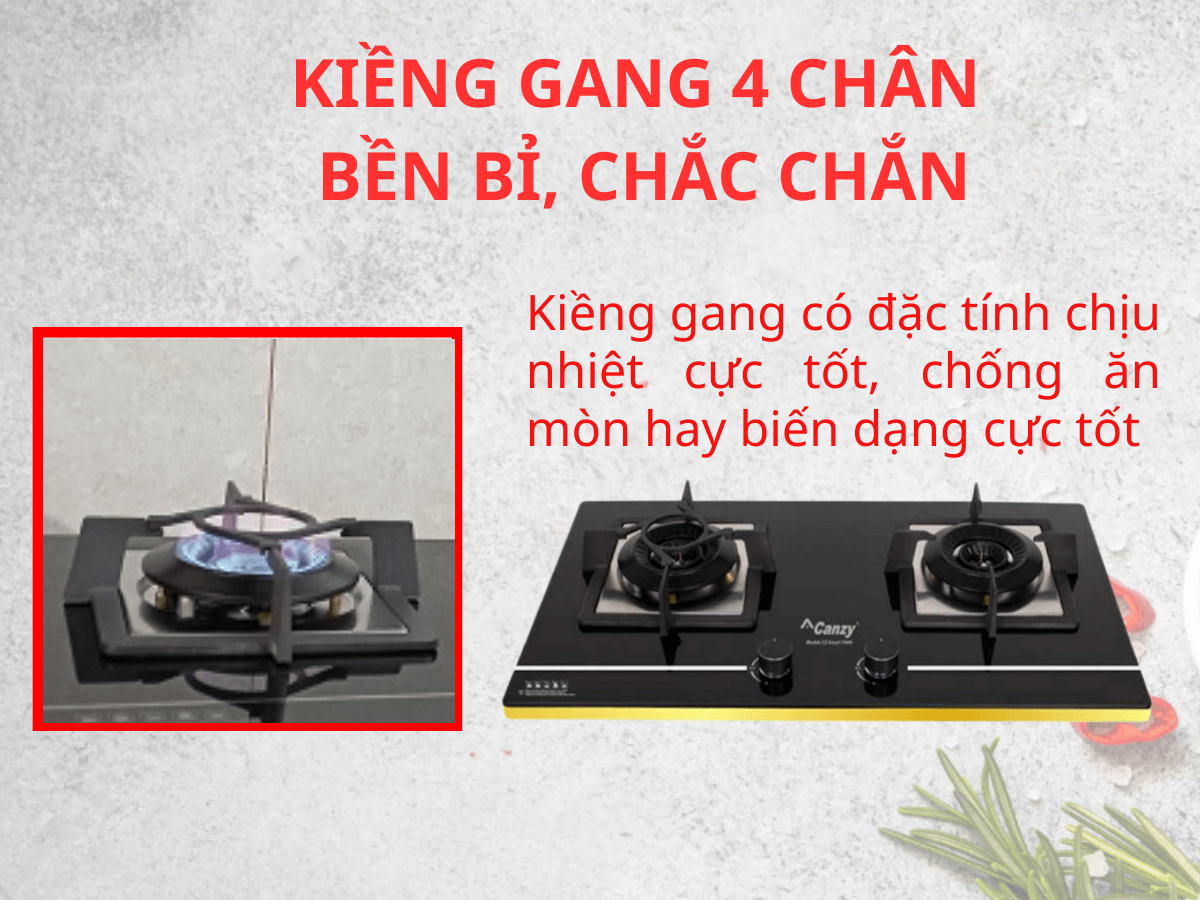 Bếp Gas Canzy CZ Smart 788G có kiềng đỡ được làm từ chất liệu gang cao cấp. Với đặc tính siêu bền, chống biến dạng và hao mòn dưới tác động nhiệt độ cao, dù thường xuyên đun nấu với tần suất cao. Thiết kế 4 chân chắc chắn, có độ bền cao nên có có thể chịu được trọng lượng lớn từ xoong nồi và chống trượt, giúp xoong nồi được giữ ổn định trên bếp mà không bị nghiêng lệch. 2 kiềng bếp cũng được thiết kế rời để dễ dàng tháo lắp, tiện lợi cho việc chùi rửa.