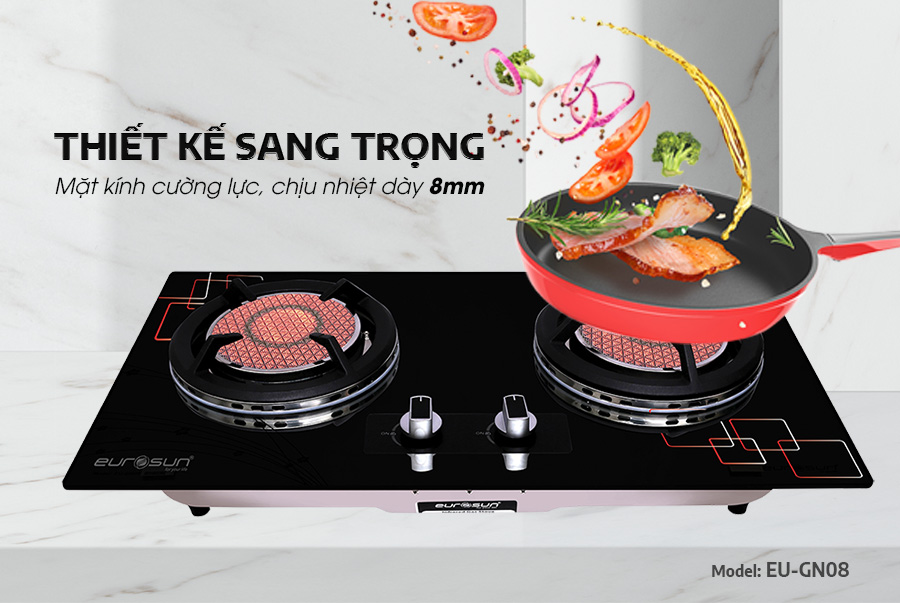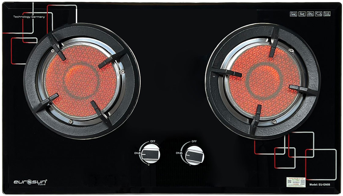 Bếp ga âm hồng ngoại Eurosun EU-GN08, với thiết kế 2 lò nấu chín thức ăn dưới 2 tác động là bức xạ nhiệt hồng ngoại và bằng nhiệt từ lửa nấu ăn nhanh chóng, tiết kiệm đến gần 40% lượng gas tiêu thụ, tiết kiệm thời gian đun nấu tới 25% so với bếp gas thông thường.