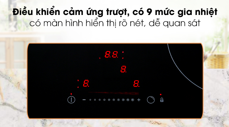 Bếp hồng ngoại 3 vùng nấu hoạt động với công suất tổng là 5700W, 9 mức nhiệt, gia nhiệt nhanh tiết kiệm thời gian nấu nướng