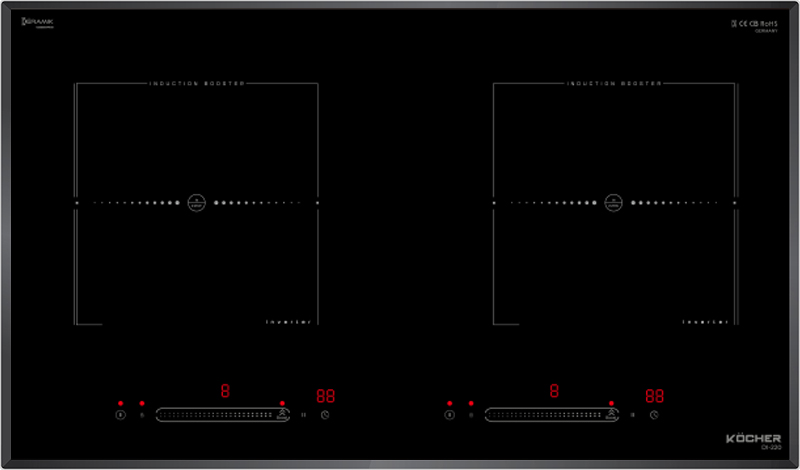 Đây một trong số rất ít bếp từ có thể đạt Booster lên đến 2200W. Với thiết kế của bếp từ Kocher DI-220 cả 2 vùng nấu có khả năng kích công suất Booster cực đại lần lượt là 2200W | 2200W giúp công việc đun nấu trở nên nhanh chóng và tiết kiệm thời gian khi cần thiết.