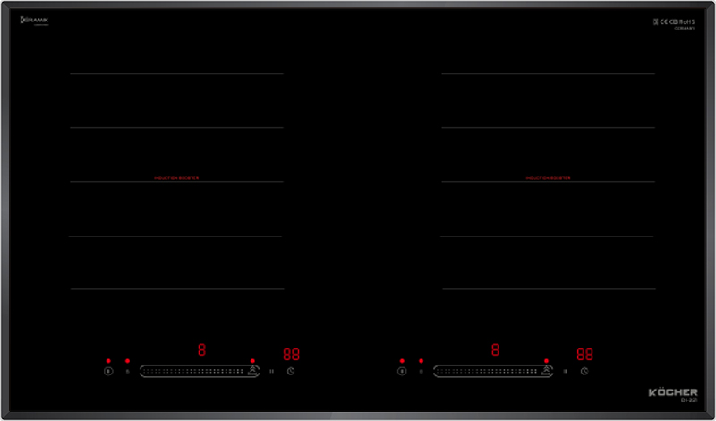 Đây một trong số rất ít bếp từ có thể đạt Booster lên đến 2200W. Với thiết kế của bếp từ Kocher DI-221 cả 2 vùng nấu có khả năng kích công suất Booster cực đại lần lượt là 2200W | 2200W giúp công việc đun nấu trở nên nhanh chóng và tiết kiệm thời gian khi cần thiết.
