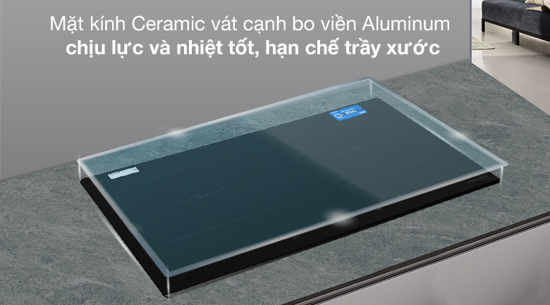 Mặt bếp phủ chất liệu kính Ceramic vát cạnh bo viền Aluminum chịu lực chịu nhiệt tốt, hạn chế trầy xước